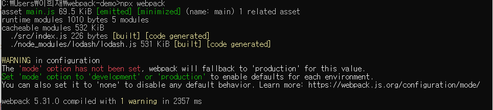 npx webpack를 실행해보자, src/index.js에 있는 스크립트를 Entry Point로 사용하고 dist/main.js를 결과로 만든다. npx 명령은 Node 8.2/npm 5.2.0 이상을 데리고, webpack binary(./node_modules/.bin/webpack)를 실행한다.