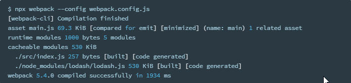 npx webpack를 실행해보자, src/index.js에 있는 스크립트를 Entry Point로 사용하고 dist/main.js를 결과로 만든다. npx 명령은 Node 8.2/npm 5.2.0 이상을 데리고, webpack binary(./node_modules/.bin/webpack)를 실행한다.